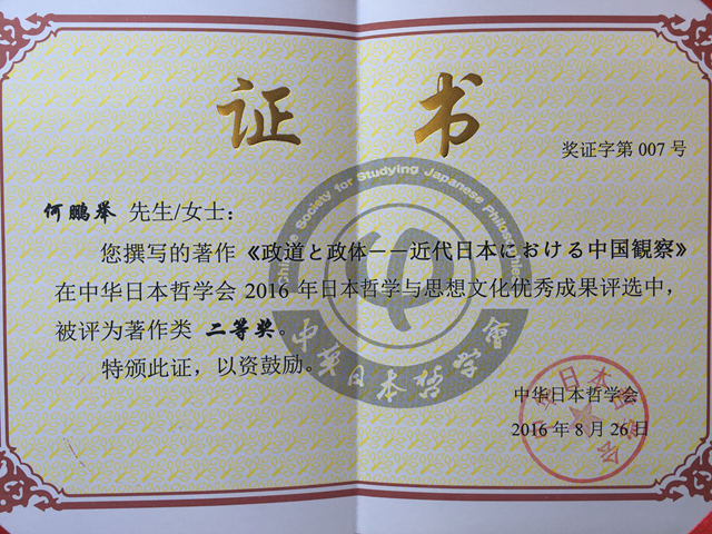 会议期间,何鹏举老师的专著《政道と政体――近代日本における中国観察》荣获中华日本哲学会2016年日本哲学与思想文化优秀成果著作类二等奖。该奖项自2015年起每年评选一次,旨在推动我国日本哲学与思想文化领域学术的发展。