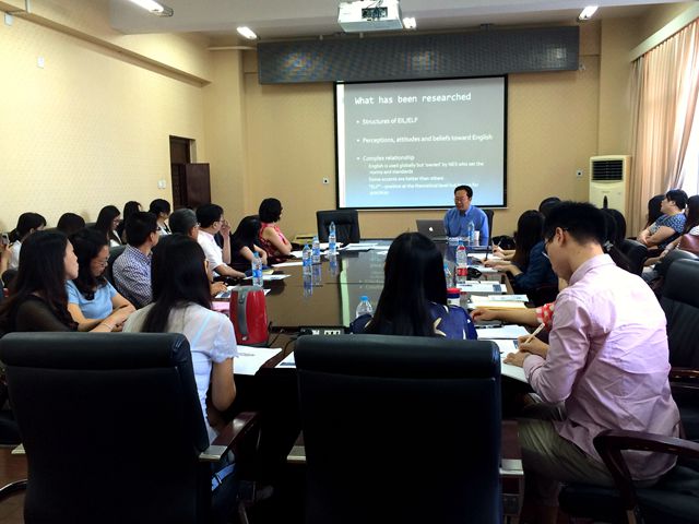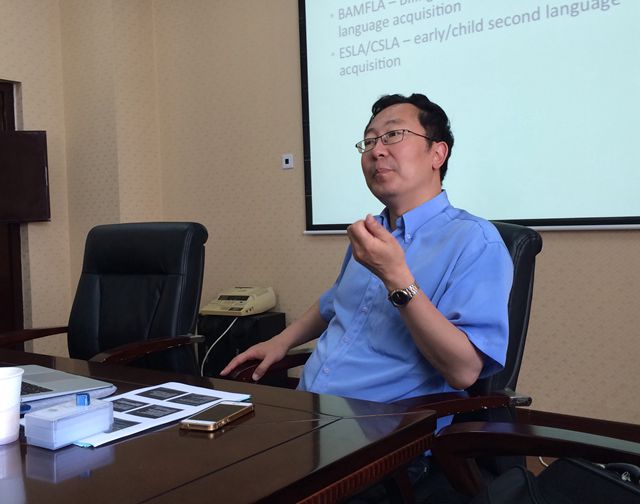 李嵬教授在 “English LanguageTeaching (ELT) in the era of globalization(全球化背景下的英语语言教学)”的讲座中为我们讲解了全球化进程对英语语言教学的影响以及在此背景下英语教学和研究的关键点,还介绍了他自己提出的 “translanguage” 的概念和相关研究。下午题为”Early Acquisition of English as a second language(英语作为第二语言的早期习得)”的讲座中李嵬教授则通过研究实例讲解了儿童习得第二语言的历史、研究现状和未来发展方向等。讲座内容代表语言学跨学科研究取得的最新进展,同时和大家的外语学习密切相关,讲座中李嵬教授举出了一些实际案例使得整个讲座生动有趣。