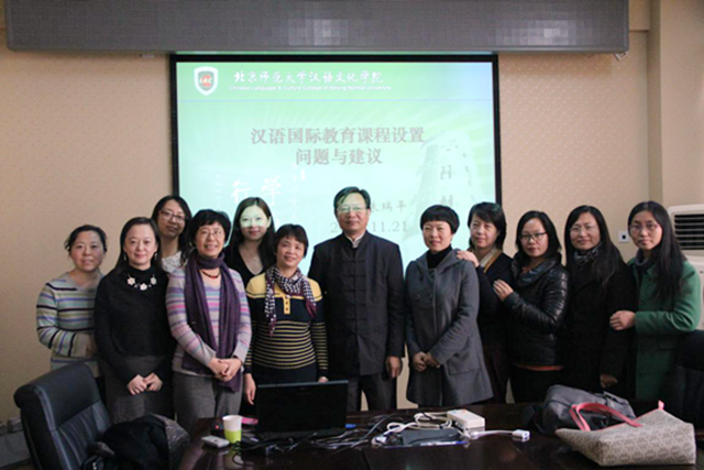 2015年,我院将招收第一批汉语国际教育专业硕士研究生。为了更好地迎接招生工作,交流汉语国际教学的经验,2014年11月21日下午,我院邀请北京师范大学汉语文化学院执行院长、博士导师朱瑞平教授来我院做学术报告,报告的题目为“汉语国际教育课程设置问题与建议”。在报告中,朱教授首先介绍了国家汉办对汉语国际教育专业硕士学位课程的基本要求, 然后介绍了北京师范大学汉语文化学院的课程设置及其教学方法, 特意介绍了他们的团队授课方式, 即一门课程由多个教师讲授, 团队授课便于充分发挥各位任课教师的研究特长和兴趣, 同时也能促进教师交流探讨教学内容和方法,互相取长补短,最终达到提高教学效果的目的。